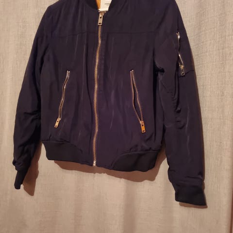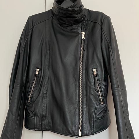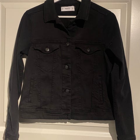 Mango Andre jakker dame i størrelse M, svart farge. Jakken er laget av skinnmateriale og har glidelåslukking foran. Den har detaljer som glidelåslommer og en metallplate med merke på innsiden.