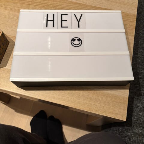 Rusta AB lysboks med utskiftbare bokstaver og symboler. Produktet har et rektangulært design med hvit front og svart bakside. Lysboksen kan henges på vegg eller stå på en flat overflate. Passer til dekorasjon og meldingsformidling i hjem eller kontor.