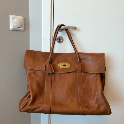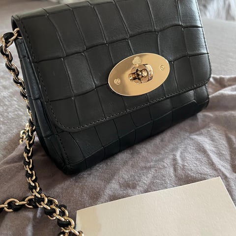 Pent brukt Mulberry Lily Charcoal Medium. Vesken har en gullfarget kjedestropp og en klaff med lås i gullfarget metall. Innvendig følger liner flere rom og lommer for organisering.