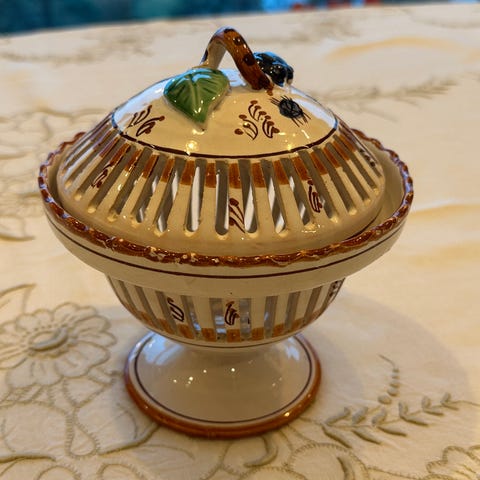 En blomsterpotte i glasert keramikk med håndmalt, tradisjonelt middelhavs- blomsterdekor. Trolig produsert i Vietri sul Mare, 1950-170-tall. Signert Italy/314.