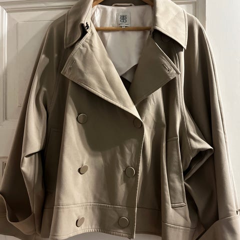 Second Female Krizian jakke i størrelse L, farge hvit og beige. Jakken har to brystlommer med klaff og knapp, samt glidelåslommer i front. Materialet er mykt og plysjaktig, med glatt fôr på innsiden. Jakken lukkes med knapper foran og har en rund hals uten krage.