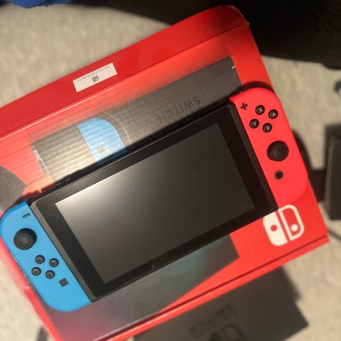 Nintendo Switch konsoll med røde og blå Joy-Con-kontrollere. Kjøpt i 2022. Brukt svært lite. Hovedsakelig på tv.