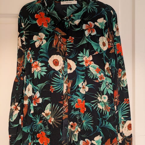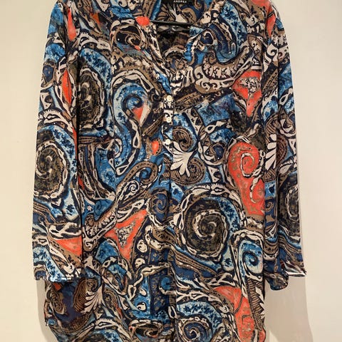 Bluse i størrelse M med flerfarget mønster. Skjorten har knappelukking og langt erme. Passer til kvinner. Kan sendes mot at kjøper betaler porto