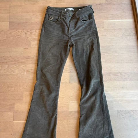 Stilige bukser i en dyp, mørk olivengrønn farge. Laget i myk, tynn cordfløyel med høy midje og utsvingte ben (sleng). Buksene er forkortet med ca. 2 cm, noe som vises på bildene.