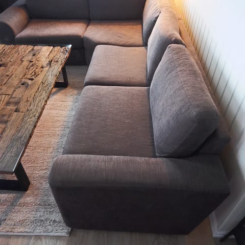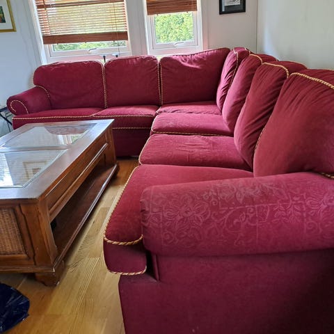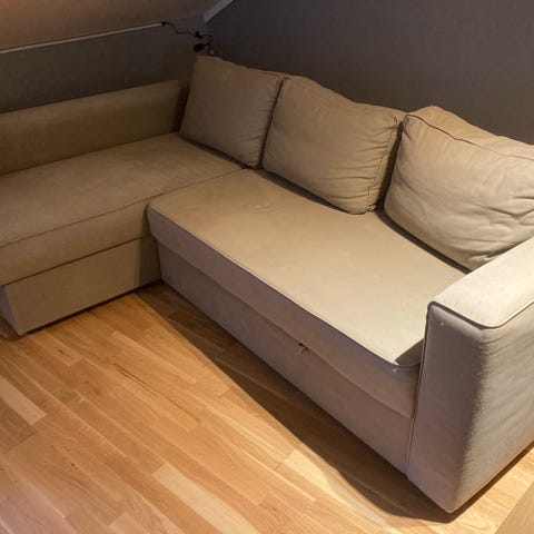Jeg gir bort en hjørnesofa. Den trenger rengjøring. Den deles i to deler. Det trengs to personer for å bære den ut (jeg kan ikke hjelpe).