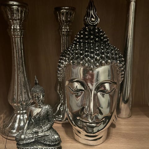 Dekorative ornamenter laget av sølvfarget metall. Inkluderer en stor Buddha-hodefigur, en sittende Buddha-figur, en høy vase med dekorative strå og to høye lysestaker. Passer til innendørs dekorasjon og interiørbruk.