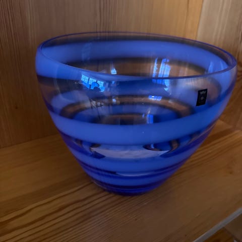 Stikkord: Steninge Slott, Lindshammar, Britten Pååg, Apple, eplemotiv, koboltblå, blå glasskål, skandinavisk design, art glass, sandblåst, fruktbolle, retro, 2000-tall, Sverige, dekorbolle.