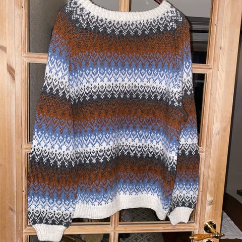 Tykk genser, strikket i Gann garn Drøm. Strikket i str. M, men stor i størrelsen. Nydelig rødfarge. Brukt to ganger.