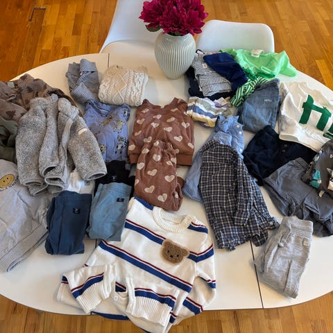 Klespakke med størrelse 68/74/80. Inneholder div bukser, bodyer, hele ulldrakter, hjemmestrikk og tøfler (noe små flekker på disse). Passer fint nå til vinteren. Merker ifra f.eks hummer og Joha.