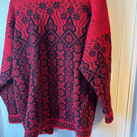 Dale of Norway L (stor L) strikket ulljakke / kofte i rød farge, designet for både kvinne og mann. Genseren er romslig på størrelse, har tradisjonelt norsk mønster og er laget av 100% ull. Den har solid glidelås foran , strikk nede med regulering, og er produsert i Norge. Svært lite brukt, grunnet feil størrelse. Anmerkninger: noen få nupper nede på innsiden. Passer til penbruk, utendørsbruk, og er god og varm.