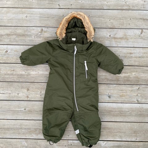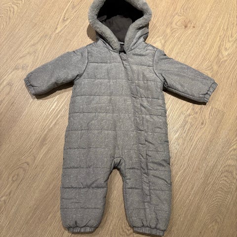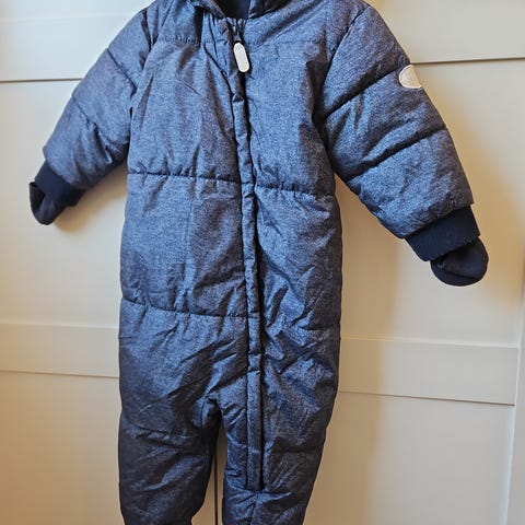 Det står at vinterdressen skal være str 80, men det stemmer ikke. Passer til str 74. Veldig kjekk og varm dress. Glidlås på begge sider, slik at den er enkel å ta på baby. Hull på høyre fot, er ikke helt åpent. Har bare begynt å flusse opp i det ytterste stoffet. Se bilde av det. Ellers i fin stand.
