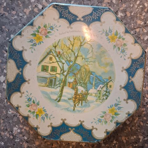 To gamle åttekantede bokser fra Fredriksstad preserving. Mål og tilstand se bilder. 200kr pr stk.