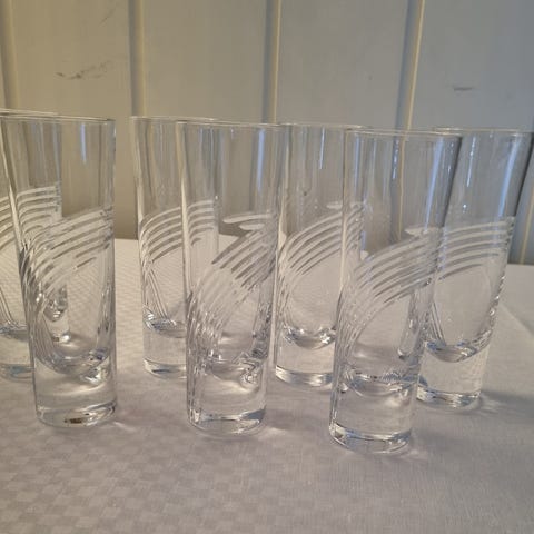 Selger her 7 glass SURF vann-/farris krystallglass 30cl. - 15,5cm høye. Det spesielle mønsteret rundt glasset gir det et unikt uttrykk og gjør det perfekt for servering av mineralvann, brus eller andre sprudlende drikker. Glassene er hele uten riper, skår eller hakk - har stått i skapet her i mange år, og er knapt nok brukt. Selges kr 300,- pr. stk. eller kr 1.750,- for alle 7.