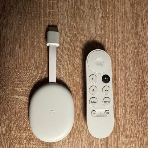 Google Chromecast HD Digital med fjernkontroll og HDMI-kabel. Enheten har en hvit farge, leveres med fjernkontroll, usb kontakt og ledning