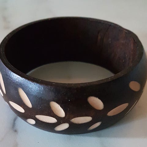 Vintage armbånd fra India 80tallet. Ben og messing.,svart og natur.Tykt med messinglås,litt trått i lås,må lirkes litt på plass. Gni litt med stearin kanskje Bredde 4cm,dia inni 6cm.