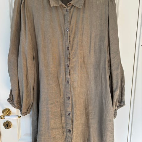 55% lin, 45% bomull. Str 42,men liten i str. Brukt 1 gang. Det er et lite hull på tyllen nederst. Vises ikke og kan lett sys. Beige