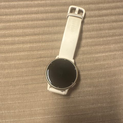 Selger min Garmin Vivoactive 5. Klokken er fint brukt, men bærer preg av daglig bruk; noen små riper på skjermen og noe slitasje på reimen.