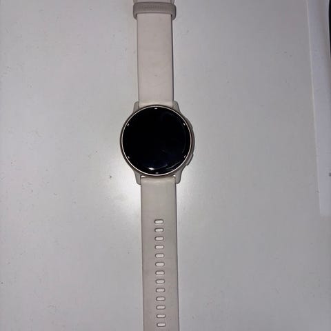 Selger min Garmin Vivoactive 5. Klokken er fint brukt, men bærer preg av daglig bruk; noen små riper på skjermen og noe slitasje på reimen.