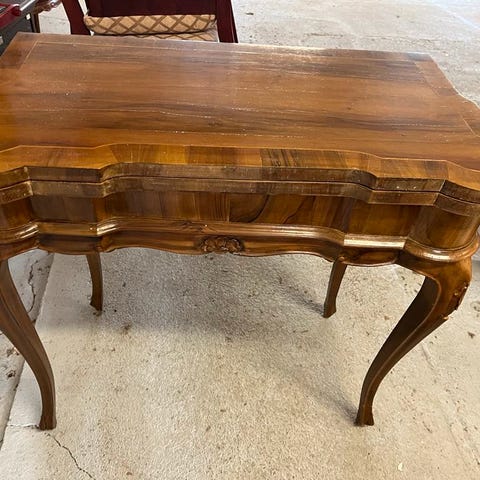 Spill/bridge bord fra sent 1800 tallet med 2 stoler. Bordet utslått 88 x 86 cm. Bordplaten er hengslet og da er den 43 x 88 cm. Høyde 77 cm. Som vist på bildene er det et oppbevaringsrom i bordet. Stolene hører med til bordet, og at det er original stoffet. Må hentes.