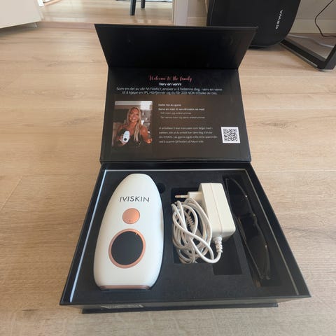 IVISKIN IPL hårfjerningsapparat i hvit farge. Enheten har digital skjerm for visning av brukstilstand og antall pulser. Designet for hjemmebruk med fokus på hårfjerning ved hjelp av IPL-teknologi