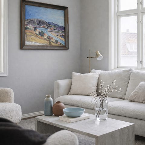 Originalt oljemaleri av Thomas Frang selges. Bildet viser klassisk norsk stemning fra setra; med fjell og gamle tømmerhus, signert av kunstneren nederst til høyre. Alderen anslås til 1940-1960, motivet er typisk for perioden. Lerretet måler 69 x 56,5 cm uten ramme, med original gullfarget treramme bygger det totalt 85 x 72,5 cm (rammen utgjør 8 cm på hver side). Original ramme følger med og har noen merker, men er hel og dekorativ. Bildet fremstår bra med normal aldersslitasje – ingen hull eller rifter, og malingen er solid uten avflassing. Perfekt for hytte, stue eller samler.