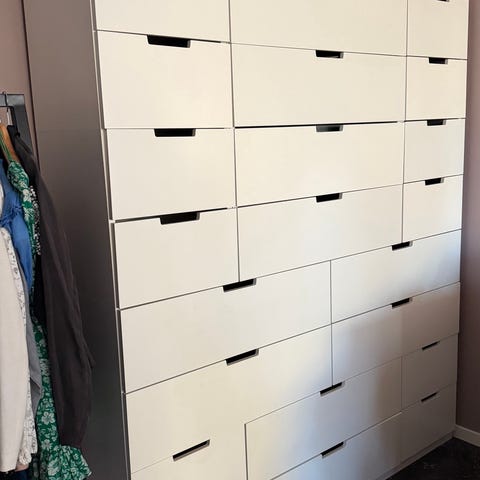 En fin kommode med 3 skuffer. Har også hyller som kan justeres og flyttes på sånn man vill. Usikker på merket, men likner IKEA. Usikker på hvor høy og bredd den er, men kan måles hvis man lurer. Er godt brukt med noen skader inni skuffene, men åpner helt fint.