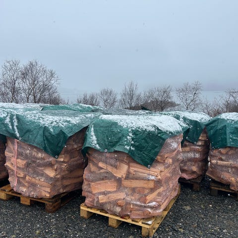 1000l sekker av tørr bjørkeved ustablet