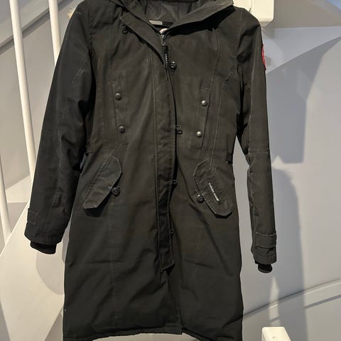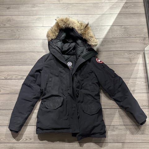 Canada Goose Annet yttertøy i størrelse M for kvinner. Jakken er svart med hette og pelskant. Materialet og designet er egnet for utendørs bruk.