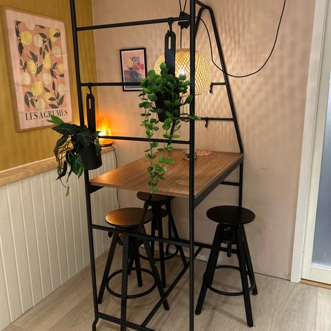 Pent brukt IKEA Håverud spisebord med to tilhørende barkrakker selges. Veldig ålreit bord med smarte muligheter for oppbevaring.