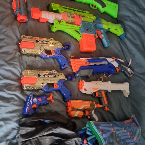 Nerf våpen, kuler, beskyttelesesbriller, vest etc
