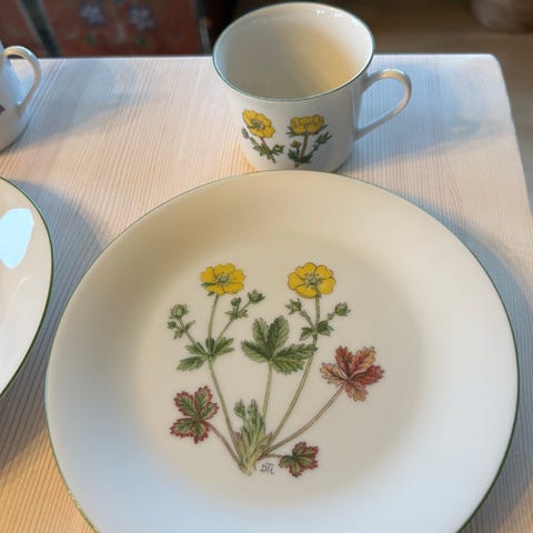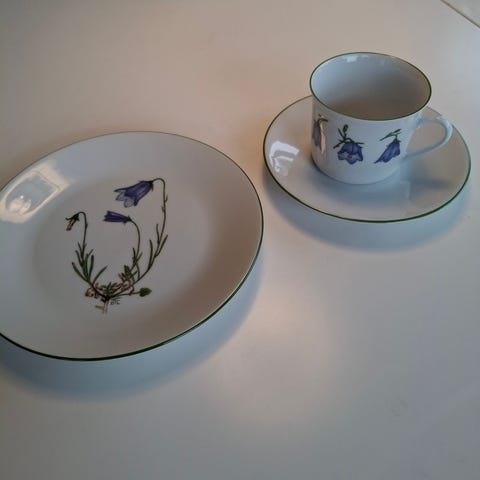 Flott og i veldig god stand selges 8 komplette kopp skål og asjett for