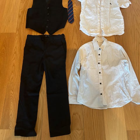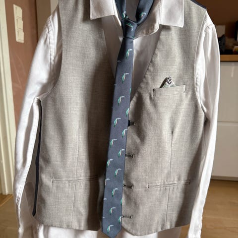 Som ny, hvit finskjorte i størrelse 134 og svart Pascal slips i størrelse M. Skjorten har ingen flekker, slitasje eller skader. Slipset er 41 cm lang, ferdig knyttet og den har en knapp ting du kan trykke på gjemt i slippsknuten som du bruker når du skal justere slipset. Slipset har ingen slitasje eller skader det heller. Klespose 7