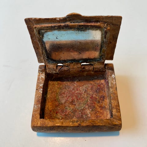 For søljer/smykker. Dreiet type. Boks med lokk og låsefunksjon. Trehvit. 1800-tallet. Høyde 8 cm. Diameter 15 cm. Kan pakkes godt og sendes hvis ønskelig.