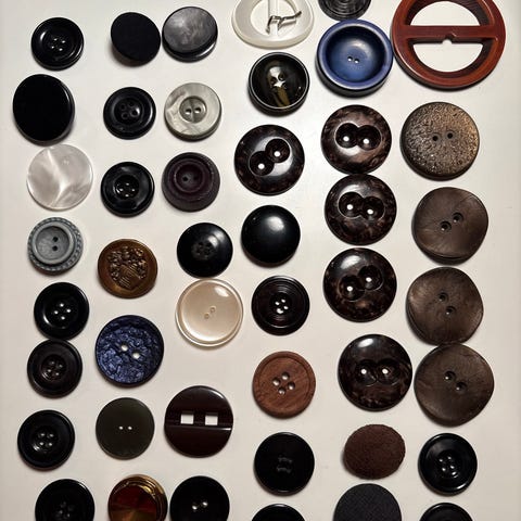Ulike vintage fargede knapper i grønn, rød og blå plastmateriale. Knappene varierer litt i størrelse, (ca 2 cm) med flere design og fire/to hull for søm.
