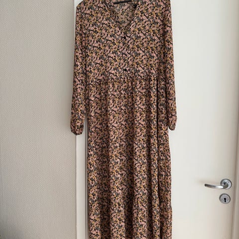 Sort kjole med brune blomster i størrelse XS. Kjolen har tynt knytebånd i livet. Kun brukt en gang.