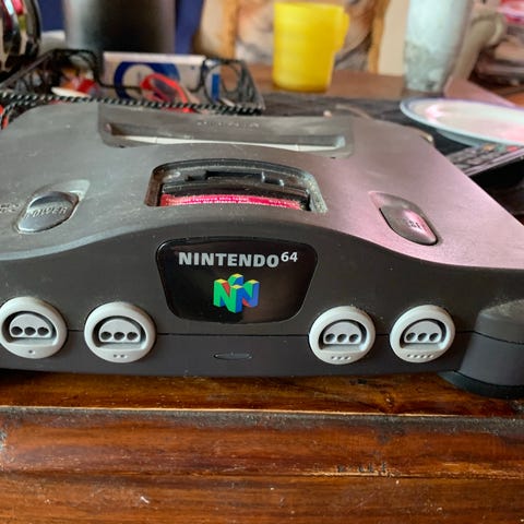Nintendo 64 spillkonsoll. Klassisk TV-spillkonsoll fra Nintendo med fire kontrollerporter i front. Bildene viser også to Nintendo 64-spillkassetter, blant annet Super Mario 64 og The Legend of Zelda: Ocarina of Time. Konsollen kobles til TV og bruker originale Nintendo 64-spillkassetter. Egnet for bruk med kompatible Nintendo 64-kontrollere og tilbehør.