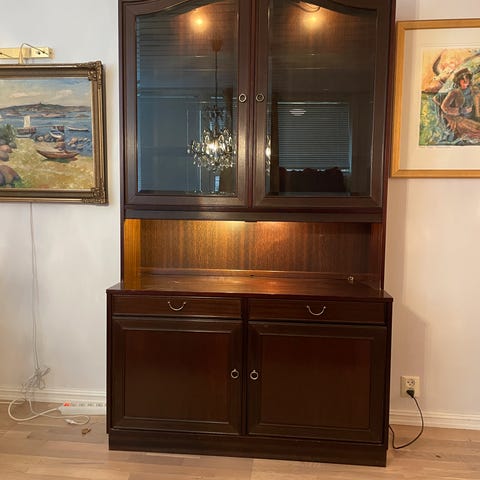Vitrine skap designet og produsert i England- kjøpt hos Engelske Møbelhuset/Drammen. Mahagony treverk i mørk brun farge. To delt skap bestående av: