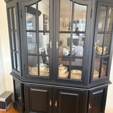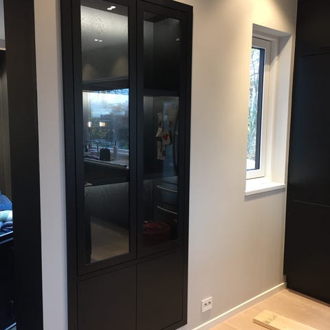 Overskap: dybde 37 cm, høyde 107 cm, bredde 150cm. 2 deler med glasshyller/dører, nøkkelløs. Midtre del bestående av åpne hyller