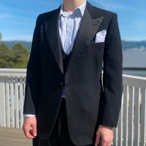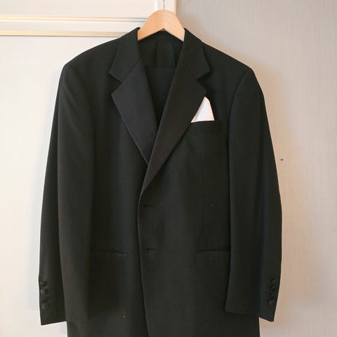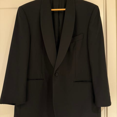 Lekker italiensk smoking i ull fra Pal Zileri str 50 nyrenset selges rimelig grunnet en liten reparasjon på lommen. Farge sort.