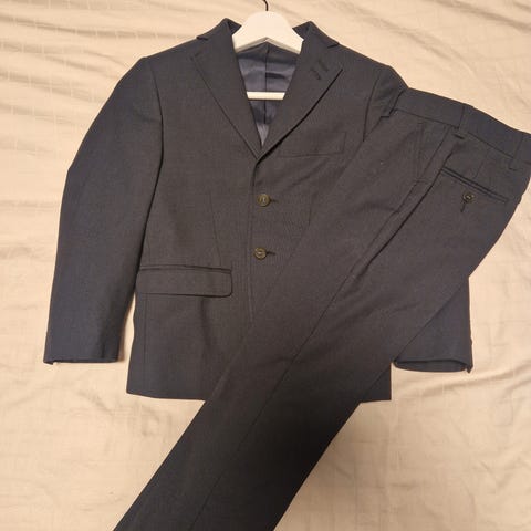 Fin blå dress fra Mayoral i str 110 til gutt. Er litt slitt på knærne men ellers veldig fin. Hvit skjorte fra Mayoral str 110 er inkludert i prisen.