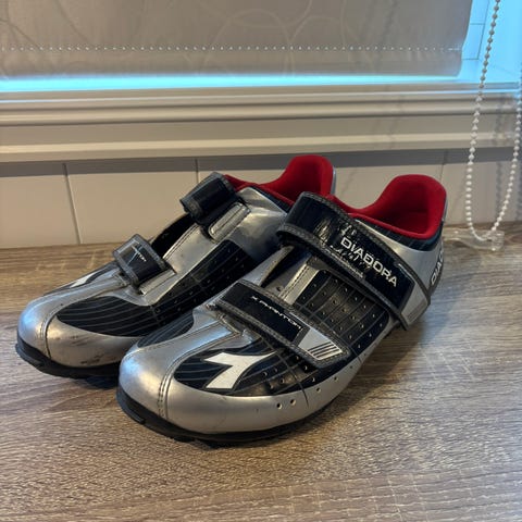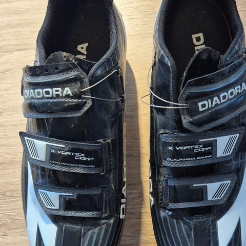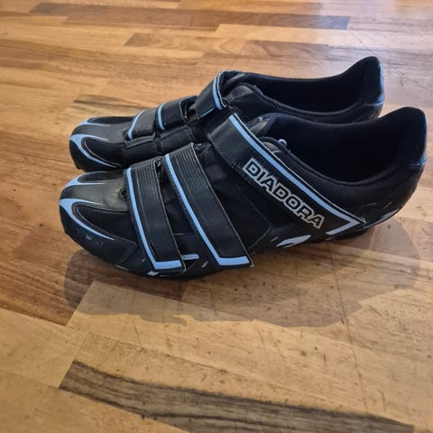 Diadora sykkelsko i størrelse 43 med svart og oransje farge. Skoene har borrelåsstramming for enkel justering og en såle designet for bruk med klikkpedaler. Kun brukt et par ganger