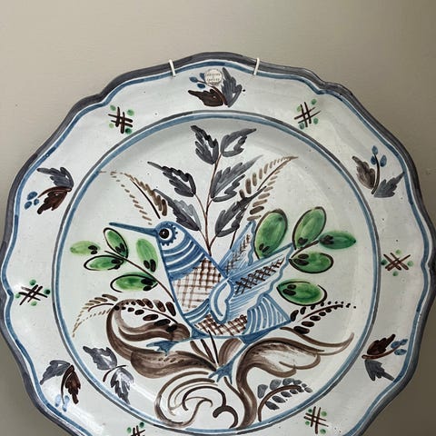 Vakkert, håndmalt keramikkfat med motiv av hus, trær og vann. Fatet har en åttekantet form og rike detaljer i blått, gult og hvitt med et landskapsmotiv i midten. Passer perfekt som veggpynt eller som et dekorativt element i en hylle.