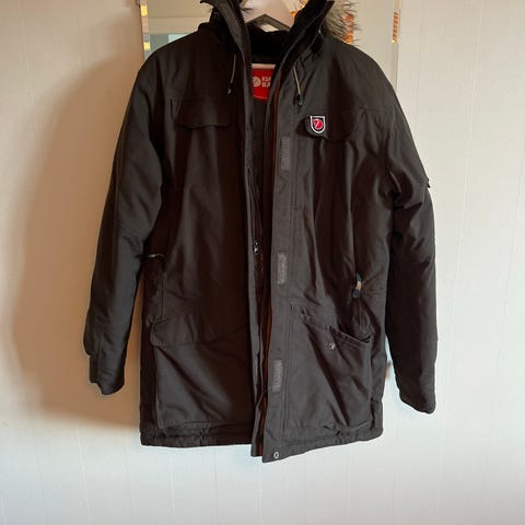 Fjällräven Vinterjakke i størrelse L for herre, i svart farge. Jakken er designet for utendørs bruk om vinteren, med isolerende egenskaper for å holde brukeren varm under kalde forhold.