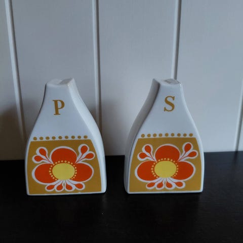 Fin gammel saltbøsse fra tidlig 60-tall. Ca 8cm høy. Propp på plass. Litt slitasje.