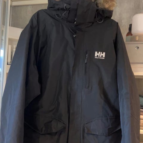 Helly Hansen jakke i størrelse S for herre. Jakken er svart og laget med vanntett materiale. Den har hette med pelskant og refleksdetaljer på ermene. Designet for utendørs bruk.