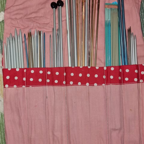 Selger unna litt diverse rundpinner og utstyr som er åpnet og brukt til 1 plagg før det ble lagt i en skuff. Veldig gode pinner å strikke med. Ringen til flerfarget strikk ble såvidt åpnet og prøvd og fant fort ut at det ikke var tingen for meg.