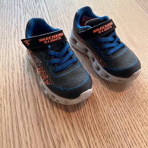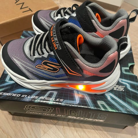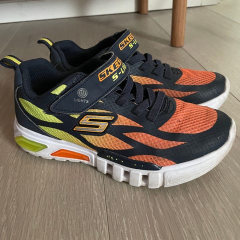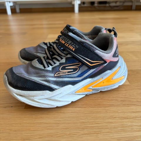 Skechers Mega-Craft barnesko i svart og oransje farge. Skoene har borrelås og snøring for enkel tilpasning. Yttersåle med godt grep og polstret innersåle for komfort. Egnet for barn.