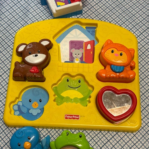 Dette er Fisher-Price Peek-a-Blocks formsorterer. Det er et pedagogisk leketøy som er utviklet for å hjelpe barn med å utvikle finmotorikk, hånd-øye-koordinasjon og problemløsningsevner.
