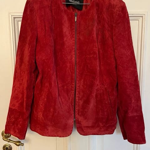 Skinnjakke i rød farge, størrelse 42 for kvinner. Jakken har glidelåslommer og en glidelås foran.