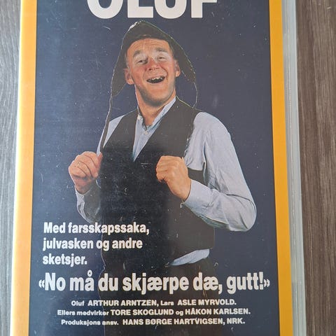 Oluf VHS videokassett med norsk komedie. Inneholder episoder som 'Med forskrappaska, Juvaksen og andre sketsjer' og 'No må du skjerpe dæ, gutt!'. Format: VHS.